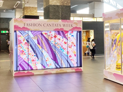 JR京都駅ビルにて実施のファッションカンタータWEEKにて1ヵ月間レンタル設置して頂きました。展示物の説明映像や開催されるファッションショーのダイジェスト映像を放映しました。