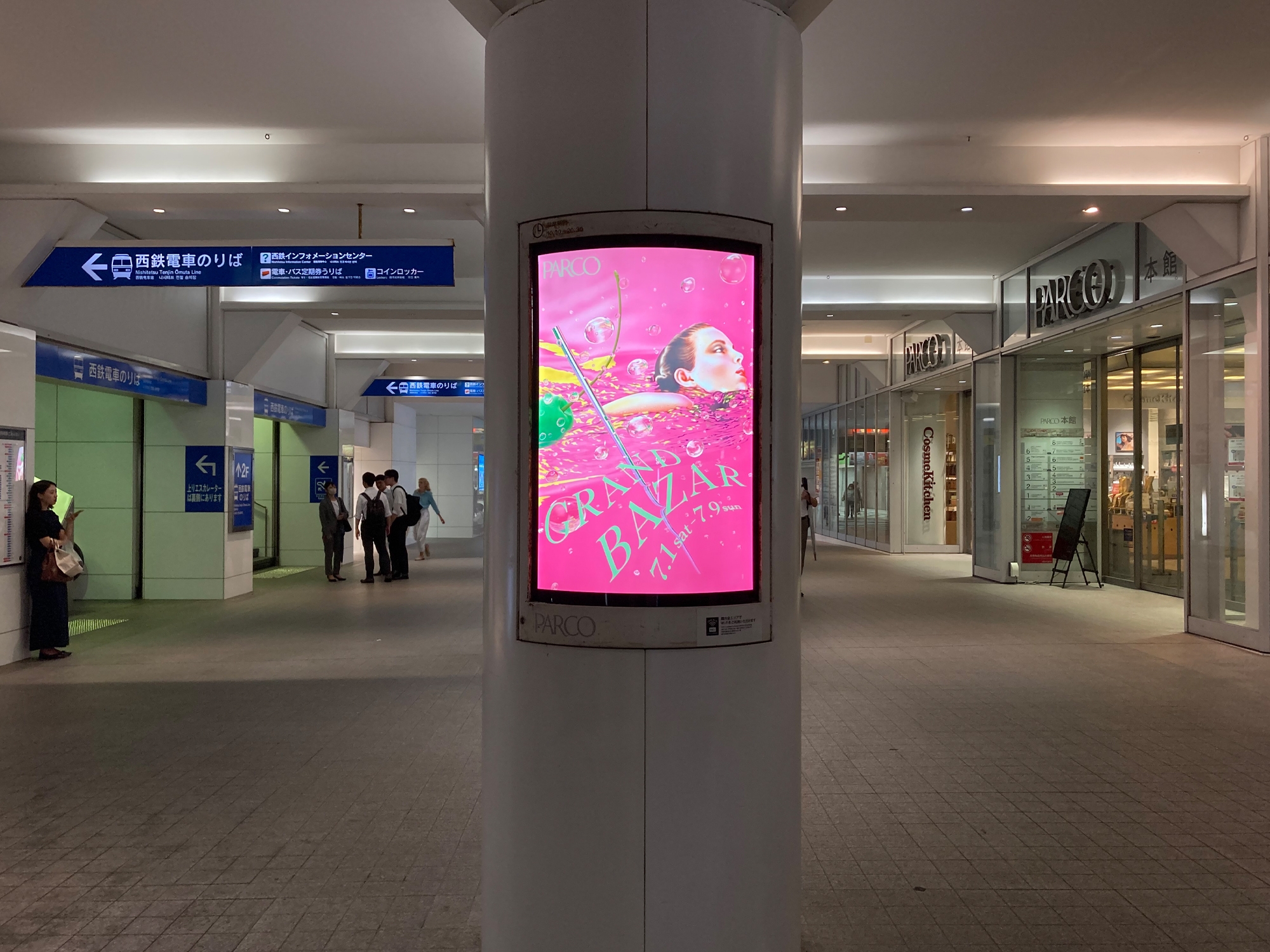 福岡パルコ様1Fのメイン出入口前のコンコース柱・壁面に対し、B1サイズFPトランスGFフィルムの不燃素材にてご採用頂いております。